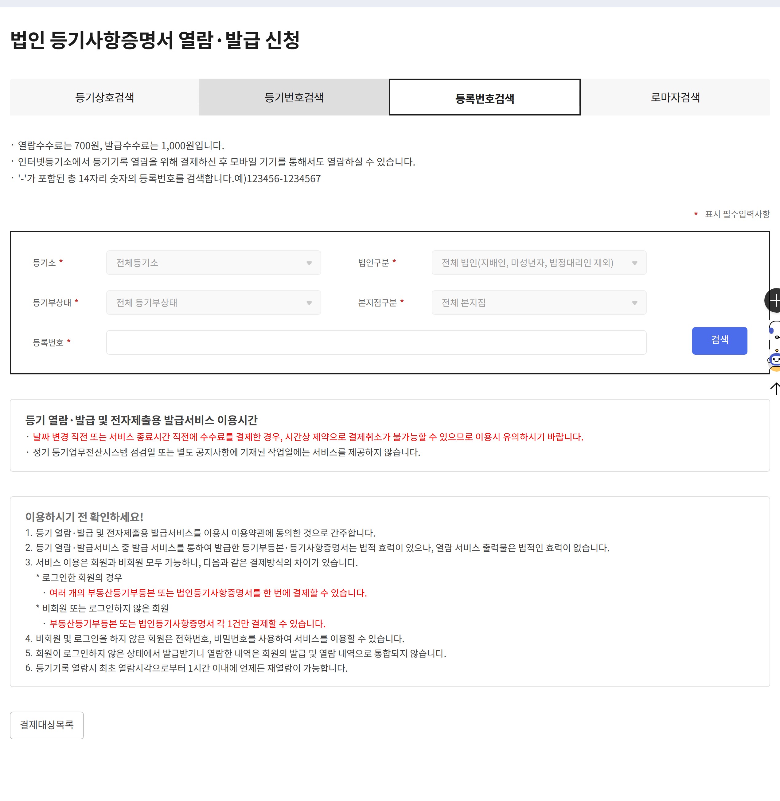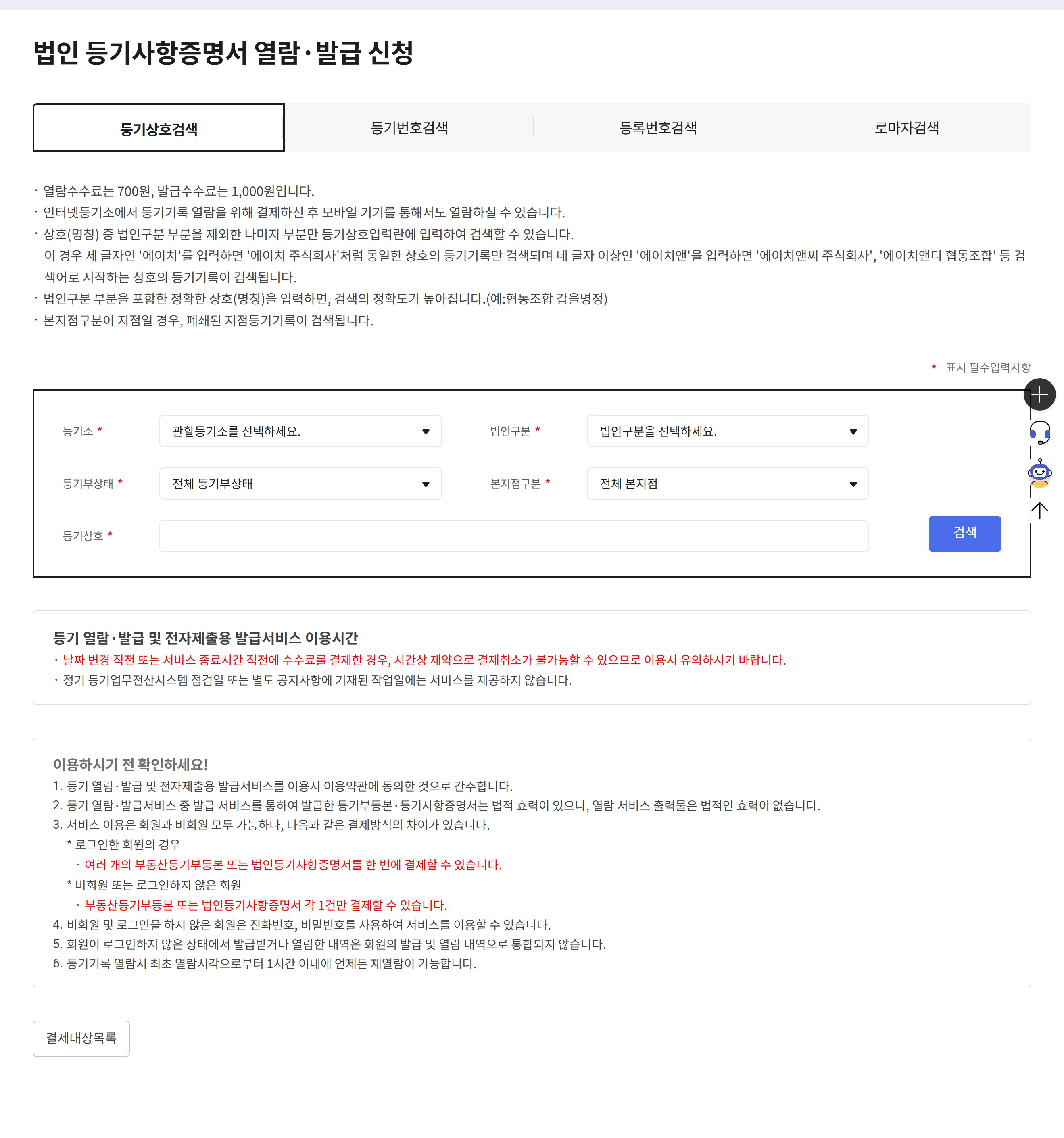 인터넷등기소 홈페이지 > 발급메뉴 > 등기사항전부증명서 > 법인 선택